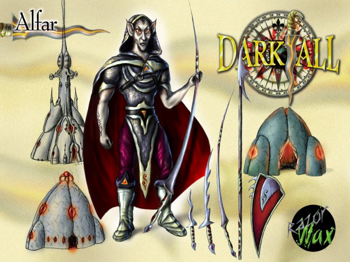 A history of war, under the leadership of an evil deity, has turned the Alfar into the mortal enemies of all other races on the continent. They are the true outcasts of Darkfall, and they would have it no other way. Physical description Millennia of dwelling underground has shaped the Alfar. The eternal darkness of the caverns has paled their skin; some senses have been sharpened while others have been dulled; a constant shortage of nourishing foodstuffs has given them a slighter stature than most surface-dwelling races. The Alfar are, in other words, a well-adapted and highly specialized race. The Alfar average height is approximately 165 cm. Few individuals deviate measurably from this average, and those who do are considered freaks of nature. An abnormally short or tall Alfar will probably never survive adolescence, and certainly never be allowed to breed. Alfar females have the same average height as males. Alfar build is generally slight, and few individuals are notably overweight or muscular. The dextrous Alfar body is perfect for moving swiftly and silently, and while they are incapable of the most extreme feats of brawn, their lithe forms conceal surprising amounts of sinewy strength. Generations without exposure to sunlight, has coloured Alfar skin in a greyish white hue which most other races find repulsive. Their skin is perfectly suited to life in the depths, where it blends nicely into the shadows, but it is extremely sensitive to sunlight: Alfar who are subjected to the harsh glare of the sun suffer serious, potentially life-threatening burns. One striking aspect of Alfar appearance, is their ears, which are huge. This obviously enables them to hear very well, which is essential when hunting or navigating underground. The ears also give them a certain bat-like appearance, and the word for Alfar in the Mirdain language translates to 'bat people'. Like their skin, Alfar eyesight is tailor-made for dark caverns but ill-suited to daylight. In pitch darkness, Alfar see naturally as humans do while holding a torch, but in daylight their vision range is limited. Alfar characters suffer severe penalties when fighting in sunlight, but man-made sources of light do not affect gameplay in the same way - though the Alfar find bright lights annoying. The Alfar themselves use various weak sources of illumination in their cities. All Alfar have red eyes. Alfar hair colour ranges from pitch black to white. All shades of black/grey/white can be seen, but a grey colour which matches the Alfar complexion is clearly predominant. Alfar never have blonde, brown or red hair. Clothing and equipment Most Alfar clothing is made from the web of the Manthe; huge domesticated spiders which have been purpose-bred for centuries. The web of the female Manthe is thick, grey and and flexible, and through several complicated processes, weavers fashion it into everything from trousers to leathery pieces of armour. For ordinary clothes, the Alfar ususally keep the original hue of the web, but when crafting armour they regularly dye the end product - black or a dark shade of red being preferred colours. The nature of the clinging, thick Manthe web means that Alfar garments are tight-fitting and relatively heavy. They material is extremely durable, and able to absorb great amounts of damage. Alfar dress in a practical manner. Usually, they wear only a simple set of clothes and dark boots crafted from the hide of the Mathe itself. When travelling in the cold tunnels of the underworld, Alfar don long, predictably grey, cloaks which double as blankets during periods of rest. Blades for Marduk Alfar steel is famed for it's combination of lightness and solidity. Their smiths craft long, thin swords which are particularly well suited to thrusting attacks, easily penetrating regular chainmail, but which also are effective as slashing weapons. Alfar blades may most fittingly be likened to the longswords of the Mirdain (surface Elves) but they are slightly heavier and, due to superior smithcraft, they are better balanced, sharper and inflict more damage. For added protection, a type of chainmail is occasionally worn on top of the aforementioned Manthe armour. These pieces of armour are extremely flexible, and are only marginally restrictive to a soldier's movement. Though Alfar chainmail makes much less noise than those of human make, they are usually only worn in all-out melee battles. Alfar reivers prefer to leave them at home, so they can move in total silence. Small, highly portable crossbows are the preferred missile weapons of the Alfar. These weapons are very similar to those used by surface-dwellers; only their dimunitive size, and the (predictable) fact that they are frequently coloured black, single them out as Alfar crossbows. A human with the crossbow skill is fully capable of using a weapon of Alfar make, and vice versa. The Alfar load their crossbows with tiny wooden bolts, whose points are jagged and hooked, making them hard (and dangerous) to remove. The Alfar frequently dip these bolts in poison, and crossbows are most regularly used as weapons of assassination, or as a means of thinning out the numbers of an enemy during an ambush. Their lack of immediate stopping power, means that the crossbows find little use during melee combat. But all-out, toe-to-toe melees never were a preferred combat tactic of the elusive Alfar. Alfar soldiers often carry with them a vial of fairly mild, standard Alfar poison. All victims struck by an arrow dipped in this fluid take damage unless a saving throw is successfully made. Weak victims may be paralyzed for a few seconds if they fail a saving throw. In addition to this 'army-issue' poison, the Alfar make several more potent or more specialized poisons, but the use of these is usually reserved for the Marduk priesthood. Geography, flora and fauna The underground realm of the Alfar lies under the barren Moldar plains, and is known (in the Alfar tongue) as Nagast. It consis