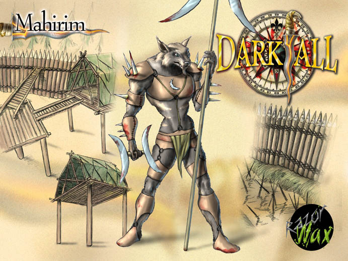 The Mahirim The vast Tribeland plains are home to this fierce race of predators. They are a physically imposing breed, who tend to rely on finely honed instincts and superior physical abilities, rather than on strategy and planning. The mahirim are fairly primitive, and their weapons and equipment tend to be crude but quite efficient. In recent years, however, a group known as the Ancients have arrived among them, bringing weapons and armour to rival those of other races. Physical description The mahirim are the tallest race inhabiting the continent of Darkfall, with both males and females averaging 245 cm. They are powerfully built, with barrel-like chests, and pawed, bearlike arms which are capable of inflicting terrible damage. A mahir at rest stands slightly hunched, as if ready to pounce. Their extraordinarily large and powerful legs, which resemble those of a canine creature, allow impressive jumps, which are often used to close the final distance between them and prey. Despite their hulking size, mahirim move with astounding speed and stamina. When running on all fours, they easily outsprint all other races, and healthy adults can run for several days without tiring. As a result, mahirim armies have a greater striking distance than those of any other race. However, a mahir who for some reason (injury, carrying large weapons, etc.) is restricted to only using the hindlegs, tires more quickly, and runs no swifter than an elf. In close quarter combat, their size limits the mahirim somewhat. They move quite ponderously when standing on their hindlegs, and they need more time to recover between attacks than, say, a human swinging a single-handed blade. They compensate for this with extremely powerful blows. Mahirim necks are short and muscle-bound. Their faces tend to be broad with large, black snouts, and pointed ears which are covered in short fur. Their large, round eyes are slightly yellowy in daylight, and shining yellow in the dark, suggesting the excellent night vision of the race. The entire mahir body is covered in shaggy fur which resembles that of a wolf in length and texture. Its colour varies between black, dark brown, grey and white. The fur tends to be slightly darker along a clearly visible spinal ridge. Their teeth are sharp and stand in uneven rows, resembling those of giant hyena. Mahirim will often bite their opponents, crushing bones with their powerful jaws or tearing out chunks of flesh. When confronting an opponent, Mahirim tend to bare their teeth, while growling threateningly. The paws of the mahirim end in stubby, clawed fingers, and they are capable of operating crude tools made specifically for their use. They also wield several types of weapons, all of which are unique to their race. The mahirim are, however, incapable of using bows and crossbows. Magic and special abilities While not as limited in their spellcasing abilities as dwarves and orcs, the mahirim are lesser magicians than elves and humans. They recover mana fairly quickly, but are incapable of hoarding large amounts of magical essence. This means that a common tactic among mahirim is to cast a handful of spells before entering combat, and then to rely on physical attacks while mana builds up again. In lengthy battles, their great mobility allows them to disengage temporarily, in order to cast more spells when enough mana has been regenerated. Animal abilities The mahirim are predators, and nature has endowed them with several abilities which give them a natural advantage over other races. Their sense of smell and hearing, in particular, are superior to those of the other intelligent species. The swift mahirim metabolism means that they regenerate damage quickly. Much like an injured wolf or lion, a mahir's wounds will heal with impressive speed if he or she is given time to rest between exertions. As a race, this allows the mahirim to be less reliant on healing magic than others. Mahirim also seem to have a natural resistance to poison and disease. While by no means immune to these threats, they have a greater chance of just shrugging off the effect, or of recovering quickly when affected. Due to their impressive sense of smell, as well as their ingrained predatory experience, the mahirim are superior trackers. When following fresh tracks and a scent trail, a trained individual will almost unerringly hunt down his prey. Even when tracks are not available, a mahir might be able to track succesfully using scent alone. In combat, the mahirim sense of hearing helps them keep track of the whereabouts of opponents. This gives them an advantage against foes which are invisible, or whose exact location are obscured by camouflage or illusionary magic. Weapons and equipment Armour The mahirim prefer not to wear heavy armour. Instead, they rely on their naturally resilient skin, which offers approximately the same level of protection as human leather armour. In addition, mahirim often use armour fashioned from the hides of animals. This type of armour has the advantage of increasing protection without excessively inhibiting movement. The mahirim are expert leatherworkers, and their pieces of many-layered hide armour are surprisingly effective. While still quite light, the most solid and well-wrought pieces rival the effectiveness of chain mail. Suits of mahirim armour usually consists of several unconnected pieces, which offer protection to the most vulnerable parts of the body. In addition to a single piece covering the torso, they commonly wear leg shins, bracers and shoulderpieces. Mahirim dislike using shields, since they greatly restrict movement. Mahirim armour is commonly studded with bone from animals and monsters. Due to the great craft used in preparing them, these bone-studs are just as durable as those in human studded armour. While Mahirim do not traditionally wear helmets, headpieces called wolfmasks have recently begun emerging from the secret forges of the Moontower (see below). In additio