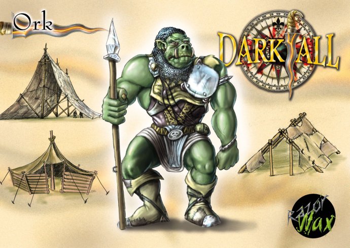 The barren highlands of Korse are home to the orks, a barbarian race of fierce warriors. Constantly raiding and invading each other and all neighbors, orks live for the glory of war and the thrill of combat. The individual ork is a natural fighter, who acquires combat skills quickly, and whose natural strength gives him an advantage over members of other races. However, a limited intelligence means that orks find it hard to learn the most advanced and intricate fighting skills. Their magical abilities are also rather limited. Physical Description Orks stand slightly taller than humans and are a great deal more muscular. They are physically intimidating to other races, and put a great deal of pride in being strong and resilient. Weak individuals are not accepted among the orks, and through generations of selective breeding, they have turned themselves into a race which in many ways is physically superior to others. However, the centuries of focusing on brawn, has left its mark on the intellectual capabilities of the race. Their skin is thick and varies greatly in colour between individuals. Orks can be dark green, dark blue, deep red, and black. Almost from birth, the orkish skin resembles the bark of an ancient tree; it is as gnarled, wrinkled and impenetrable to the wind and rain. Orks are bald and their bodies are completely hairless. The orkish skull has a low forehead and a roundish shape. Their enormous jaws host impressive sets of canine teeth, with tusks protruding from each side of the lower mouth. The size and number of protruding tusks depends on the age and status of the individual. Tusks appear when the ork reaches adult age, and grow in size as he or she progresses through the social layers of the clan. At the very highest levels of size and status, orks develop an extra tusk on each side, bringing the total to four. The tusks are used as weapons in the orkish bite attack (see below). Orkish eyes are small and deeply set, and come in an even greater variety of colour than their skin. In fact, all the main colours have been observed, with varying frequency, except brown and blue, which are unheard of. Size progression Uniquely, orks grow in size and stature throughout their lives and depending on their status in the clan. As the ork climbs new tiers of power, its size increases, until - eventually - reaching chieftain status as a nine foot tall hulking behemoth. Extemely succesful chieftains reach Warlord status. To reach this size and status, a chieftain will have to wreak several decades worth of unrelenting havok upon his enemies. Presently, the only warlord in Korse is Grrrakk the One-Eye, leader of the Iron Orks (See below). At a very few points in the history of Korse, singularly successful warlords have reached the size and godlike status of Mad Destroyer. These orkish avatars try to unite all clans under their banner, in order to lead them into savage invasions of neighbouring lands. The angry mode As an ork deals or receives damage in combat, his anger rises slowly towards a berserker rage.* When the boiling point is reached, the ork may voluntarily enter the angry mode, in which the ork deals more damage but is more vulnerable to attacks. When in this state, the ork screams, beats his chest, and swears and spits uncontrollably, not caring whether or not nearby enemies hear him. Calming down is a somewhat unpredictable process: The ork has a growing chance of leaving the angry mode as time passes. The ork is not forced into attacking while angry. Bite attacks Orks automatically use their tusks as close combat weapons. These gashing attacks are performed unthinkingly by orks whenever they are in combat with an adjacent enemy, and come in addittion to weapon attacks. The damage inflicted is quite limited but increases as the ork grows in size (see Size progression, above). Clothing & Equipment Their thick skin and resilient nature means that orks have little need for clothing. They wear short leather trousers, which usually only go down to their knees. Orks prefer to keep their torsos bare, showing off their impressive tattoos, war paint and piercings. Orks like jewellery, in particular earrings, nose-rings and other piercings, and they prefer their jewellery to be of gold. Orks also wear metal-studded bracers, shoulder pads and leggings for decorative purposes as well as for protection. Elite warriors often wear armour for additional protection. Orkish smiths fashion crude, blocky and heavy pieces of armour, which nevertheless are quite effective in stopping blows. The most common pieces are extremely heavy breastplates which cover only the back and torso, and long, thick suits of chain mail which provide protection from neck to thigh. The chain coats are made without the finesse of human smithcraft, and they are visibly uneven in thickness as well as in shape. Orkish weapons are crude but cruelly efficient. They prefer axes and swords, and they prefer them to be as large and heavy as possible. As an example, an ordinary Orcish battleaxe is too heavy to be wielded by a human, and the large, huge, and gargantuan varieties can only be used by orks who have grown in size due to increased status. Most orkish weapons are fairly simple in basic design, but with rich decoration and vicious details added after the weapon itself is finished. A typical orcish sword will have small counter-hooks and primitive, evil-looking runes etched along the side of it. Orkish swords have jagged edges, and are slightly curved. While some orks prefer the the longsword and shield combination, most use two handed weapons. Giant two-handed greatswords are common, as well as two-handed, double-bladed axes. Orkish blacksmiths also craft more exotic weapons, often designed as much to intimidate and frighten as to be effective weapons of war. Orkish special weapons often inflict massive amount of damage, but are unwieldy and slow. The Two-bladed two-hand sword is an extreme example of adventurous or