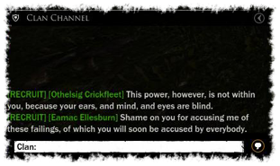 The Clan Channel becomes available once you become a member of a clan. In this channel all members of the clan can chat, no matter where they are located in the game world.