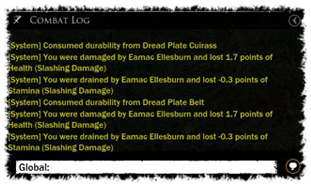 The Combat Log is where all system messages are displayed. Incoming and outgoing damage, unlocked feats, leaving and entering protected areas and many other messages the game feels you need to know are displayed here.