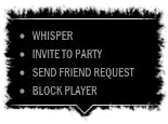 At any point you can right click on another player’s name in the chat window to reveal the whisper, invite to party, send friend request and block player options.