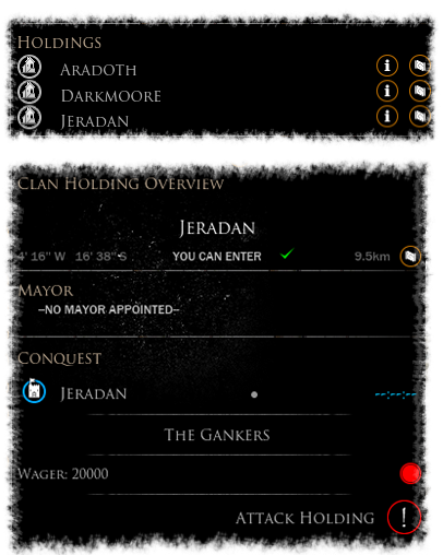 On the subject of capturing holdings, if your clan desires a holding that is not owned by another clan matters are a lot simpler as all you need to do is approach the Clan stone of said holding, hold the use button down and select the appropriate option from the radial menu. A short countdown will appear and once it counts down the holding will belong to your clan.