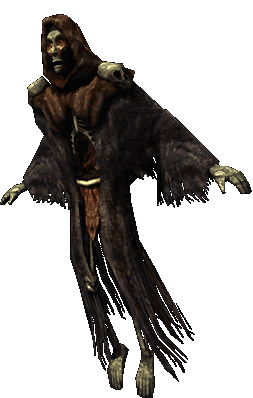 Some flesh still clings to the bones of Deathless Mage, hanging in stripes and slivers from otherwise exposed skeletons. Their heads are slightly better preserved than the rest of their cadavers, with entire patches of face still covered in half-rotted flesh. Instead of eyes, however, spots of red light shine inside empty eye-sockets. Deathless Mages wear flowing black cloaks and wield bone staves on which human skulls are mounted. All Deathless Mages are highly experienced and intelligent magic users. They tend to surround themselves with minions, and they boost themselves with spells when informed that enemies are approaching.